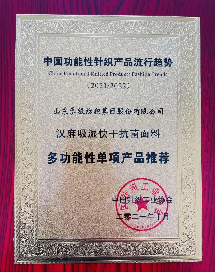 近日,由中國針織工業(yè)協(xié)會和中國國際貿(mào)易促進委員會紡織行業(yè)分會舉辦的中國功能性針織產(chǎn)品流行趨勢發(fā)布活動于國家會展中心(上海)圓滿落下帷幕。岱銀紡織服裝研究院參評的“漢麻吸濕快干抗菌面料”獲得中國功能性針織產(chǎn)品流行趨勢多功能性單項產(chǎn)品推薦。
