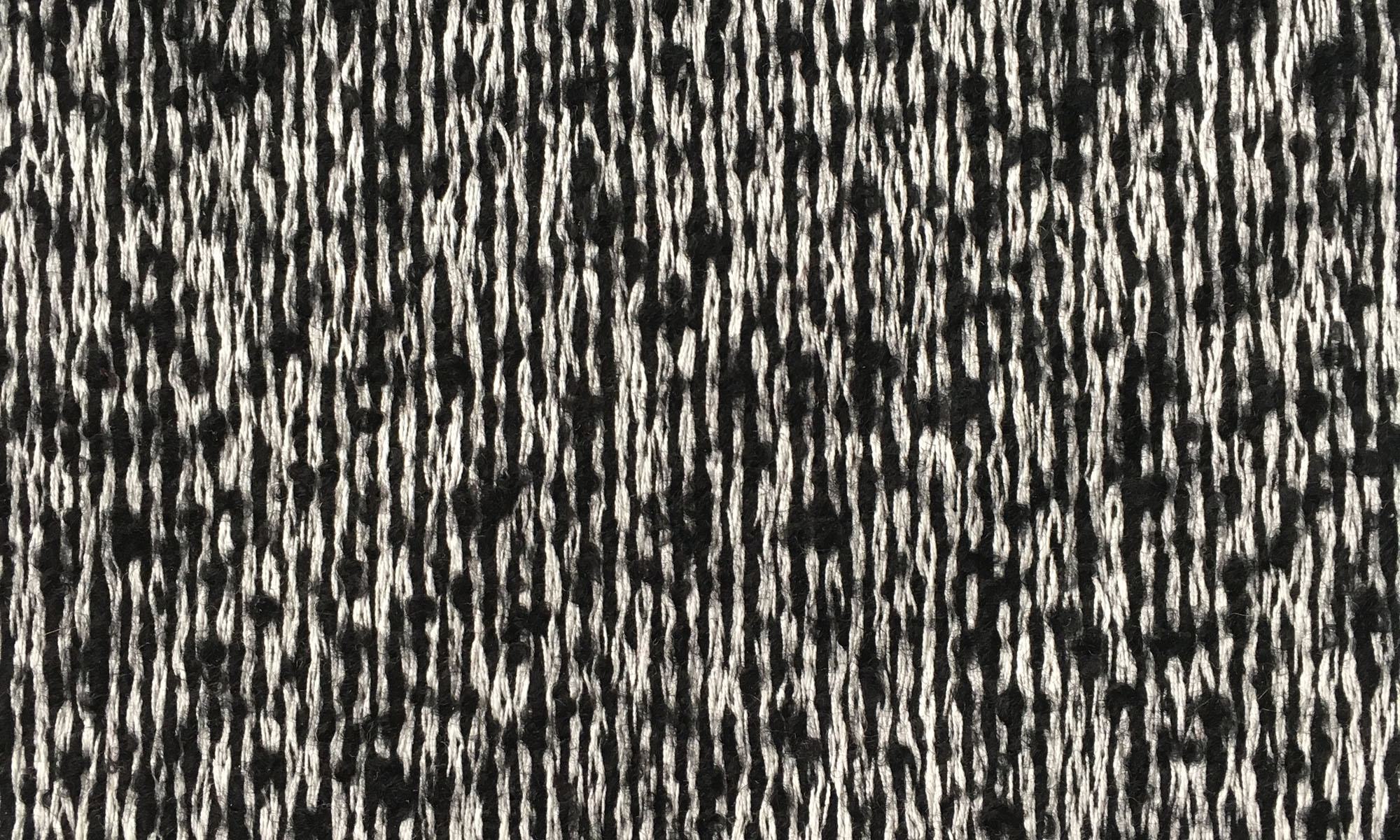 《霍金眼中的暗物質(zhì)》靈感來(lái)自霍金的預(yù)言——“暗物質(zhì)在宇宙中是存在的,單太陽(yáng)系中的暗物質(zhì)就有95%,但人類未來(lái)100年內(nèi)還找不到它?!逼叫杏钪嬷邢袷菬o(wú)數(shù)根弦在震動(dòng)(白色交織的棉紡經(jīng)紗),滋生出暗物質(zhì)(緯紗運(yùn)用黑色精紡澳毛圈圈紗)去泯滅、吞噬、坍塌。面料的紋路視覺(jué)基調(diào)偏中性,男女裝皆可,帶給人們一種神秘感、距離感、孤寂感。